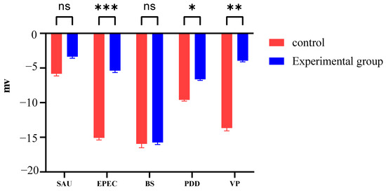 Changes in cell surface potential of SAU, EPEC, BS, PDD, and VP treated with PHMB (62.50 mg/mL). *** p < 0.001, ** p < 0.01, * p < 0.05, and ns, p > 0.05 no significant differences.