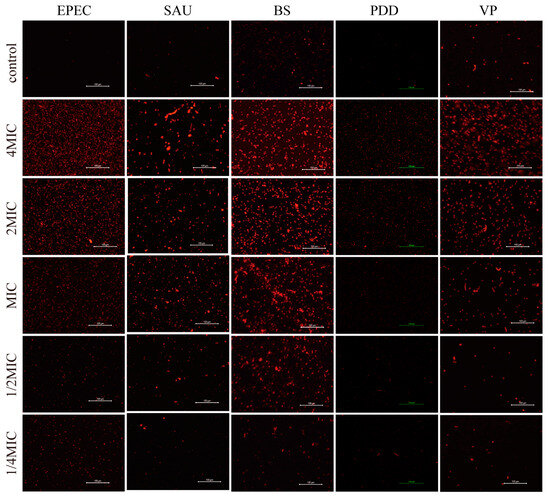 A sample of 100 µL from a drug treatment group with a concentration higher than the MIC was inoculated in a TSB plate. PDD, VP, and BS samples were incubated overnight at 28 °C and SAU and EPEC were incubated overnight at 37 °C. The minimum concentration at which bacteria do not grow in plates was MBC.