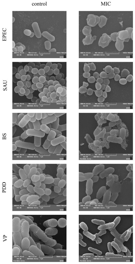 The morphology of EPEC, SAU, VP, PDD, and BS with and without PHMB treatment was observed using scanning electron microscopy (SEM). The PHMB-treated group was exposed under 1 × MIC for 2 h. Observations were performed following the previously described methods [22]. The bacterial suspension (1.0 × 106 CFU/mL) was treated with the antibacterial agents for 2 h; cells were collected and washed three times with PBS and fixed overnight at 4 °C using 2.5% glutaraldehyde. Following PBS washing, the cells were dehydrated with ethanol and then replaced twice with isoamyl acetate. Finally, the sample was fixed on the SEM carrier, sputtered with gold under vacuum, and observed using a Vega3 SEM (Tescan, Brno, Czech Republic).
