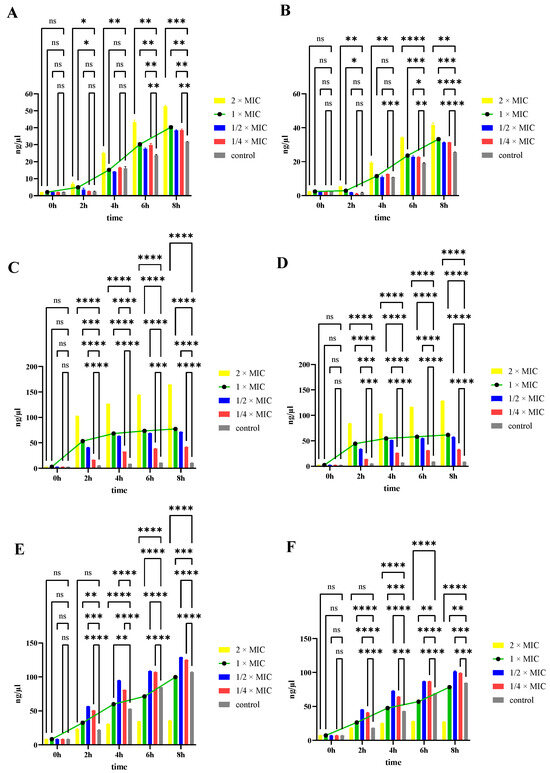 Effect of PHMB on cell permeability leading to intracellular DNA and RNA leakage. V. parahaemolyticus (A) DNA and (B) RNA leakage. P. damselae subsp. damselae (C) DNA and (D) RNA leakage. B. subtilis (E) DNA and (F) RNA leakage. ****p < 0.0001, *** p < 0.001, ** p < 0.01, * p < 0.05, ns, p > 0.05 no significant differences.