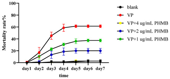 The mortality rate of L. vannamei during the process of treatment with different concentrations of PHMB after introducing 1 × 105 CFU/mL of VP.