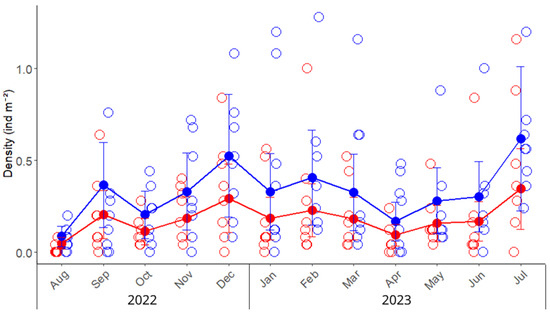 Monthly density (ind m−2) variation of the invasive green crab Carcinus maenas in the intertidal zone of the San Matías Gulf (Las Grutas, Río Negro, Argentina), from August 2022 to July 2023. Empty circles represent observed densities from sampling quadrats (25 m2 each) placed in the upper and lower intertidal zones, while solid points, lines, and error bars indicate predicted means and standard errors derived from the mixed model. Red and blue colors indicate the densities of females and males, respectively.