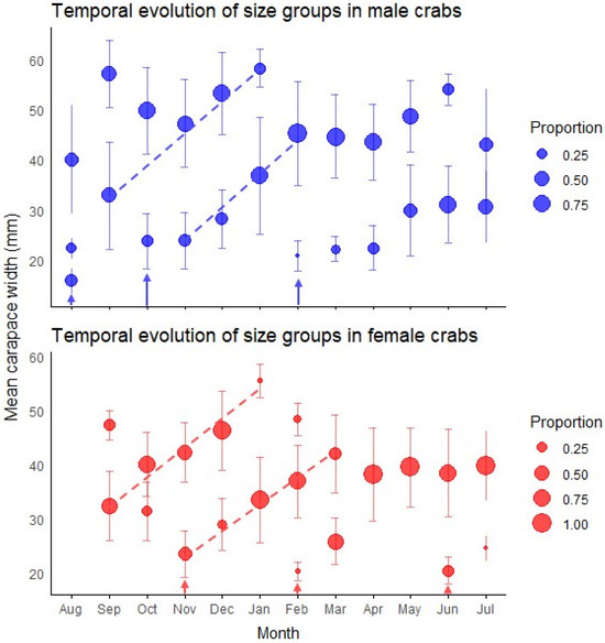 Temporal patterns of size structure in green crab populations. The plots display the monthly progression of size groups identified by mixture model analysis for both male (top panel) and female (bottom panel) crabs throughout the year. Circle size represents the proportion of individuals within each size group, while vertical bars indicate standard deviations. Dashed lines track the most conspicuous growth progression of modal size classes over time. Arrows indicate recruitment events where new cohorts appear in the population. Monthly size-class frequency distributions are presented in Figure A4 and Figure A5 and their associated statistics are presented in Table A3 and Table A4.