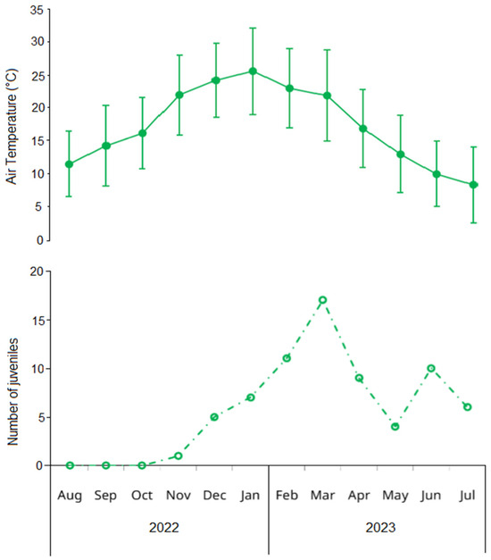 Upper panel: mean (solid points) and standard deviation (error bars) of monthly air temperature in Las Grutas (Río Negro, Argentina) obtained from the Saint Exupéry airport climatologic station. Lower panel: monthly variation in the number of juveniles of the invasive green crab Carcinus maenas in the intertidal zone of San Matías Gulf (Las Grutas, Río Negro, Argentina), from August 2022 to July 2023. Juveniles are defined as small individuals (<15 mm carapace width) whose sex could not be determined through visual examination of the abdomen.