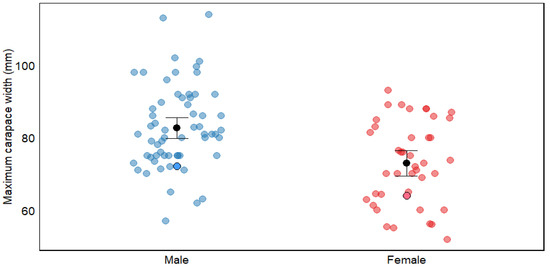 Maximum carapace width (mm) of Carcinus maenas by sex, showing comparative data between males and females. Blue dots represent males and red dots represent females, with data from both bibliographic sources (pale dots) and this study (dots with border lines). Black dots with error bars represent means ± 95% confidence interval. The figure illustrates sexual dimorphism in carapace width within this species. For detailed information on size and references, see Table S1.