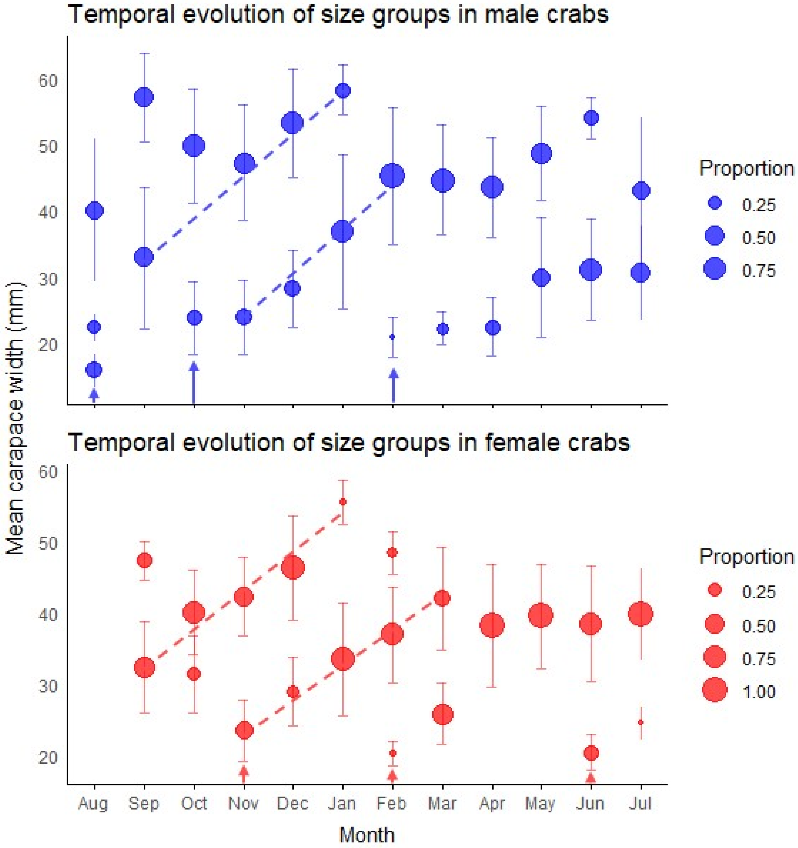 | Modal Component | Mean Carapace Width (mm) | SD (mm) | Proportion | Separation Index | |