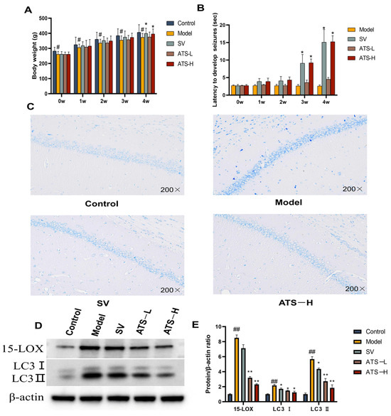 Effects of ATS on epilepsy in PTZ-induced epileptic rats. (A) The body weight of different groups of rats was assessed. (B) The latency to develop seizures. (C) Representative images of Nissl staining of the brains of rats from control, model, SV, and ATS-H (50 mg/kg) groups. (D,E) Expression of 15-LOX and LC3 was determined by Western blotting (Figures S1–S3). # p < 0.05, ## p < 0.01 vs. control group, * p < 0.05, ** p < 0.01 vs. model group.