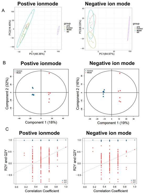 Multivariate statistical analyses of metabolomics data. (A) Positive and negative PCA score plots with QC. (B) Positive and negative OPLS-DA score plots between the control group and model group. (C) Positive and negative scatter plots of statistical validations obtained by 200× permutation tests.