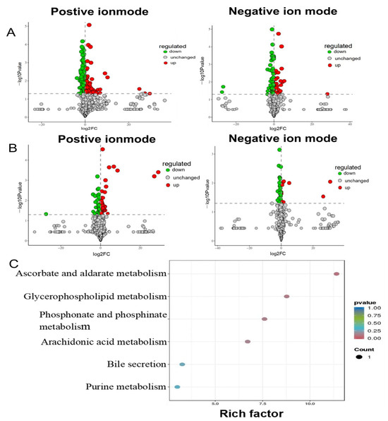 Mass spectral raw data were processed in Progenesis Qi (Waters, Milford, MA, USA) for peak extraction, alignment, and normalization. PCA and OPLS-DA were conducted using R’s prcomp (version 3.6.1) and ropls (version 1.6.2). Differential metabolites were screened by Variable Importance in Projection (VIP) ≥ 1 and values with p < 0.05 using the T test. The Progression QI software (version 2024.0.1) online METLIN database and public database (HMDB) were used to identify the selected different metabolites and to enrich the metabolic pathway through the database KEGG (https://www.kegg.jp/kegg/pathway.html (accessed on 27 March 2024)) [35].