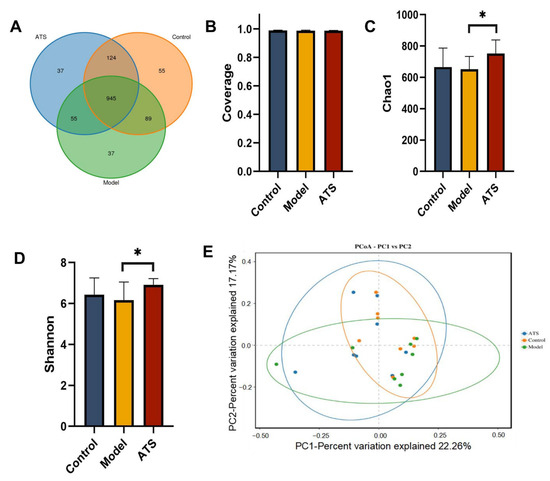 Effect of ATS on the α and β diversity of intestinal flora. (A) OTU expression in each group. (B) Sequencing depth of each group. (C) Chao 1 index. (D) Shannon index. (E) PCoA analysis of each group. * p < 0.05 vs. model group.