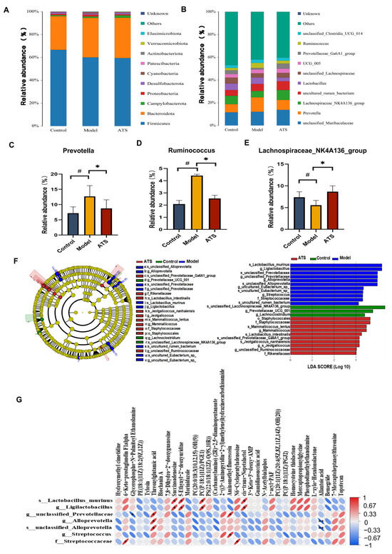 Effect of ATS on intestinal flora abundance and specific taxa. (A) Differences in the abundance of bacteria in each group at the phylum level. (B) Differences in the abundance of bacteria in each group at the genus level. (C) Relative abundance of Prevotella. (D) Relative abundance of Ruminococcus. (E) Relative abundance of Lachnospiraceae_NK4A136_group. (F) Expression of important flora in each group. (G) Correlations between the relative abundance of gut microbiota and metabolites. # p < 0.05 vs. control group, * p < 0.05 vs. model group.