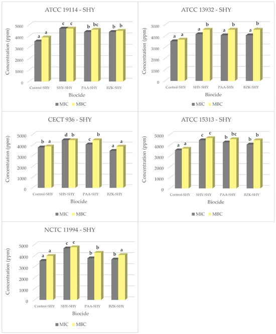 Once the adaptation of the strains to the biocides had been achieved, the MICs and MBCs for the three biocides studied were recalculated. Table 2 shows the results for MICs and MBCs of SHY in the strains adapted to biocides. In most cases, the adapted strains showed an increase relative to the control strains in the MIC of SHY (Figure 1). MIC values for adapted strains ranged between 3466.7 ± 115.5 ppm and 4666.7 ± 57.7 ppm.