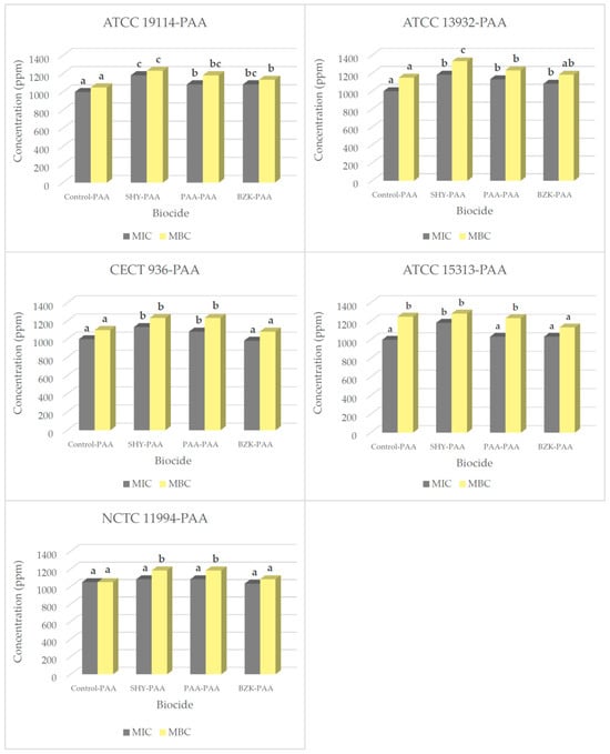 The MBC values presented by the strains adapted to the various biocides when exposed to PAA after adaptation were disparate. An increase was observed in the strains of L. monocytogenes ATCC 19114, where values lay between 1133.3 ± 28.9 ppm and 1233.3 ± 57.7 ppm; ATCC 13932, which were between 1183.3 ± 28.9 ppm and 1333.3 ± 57.7 ppm; CECT 936, where there were higher values in the case of SHY–PAA and PAA–PAA at 1233.3 ± 57.7 ppm; and NCTC 11994, where values increased for SHY–PAA and PAA–PAA at 1183.3 ± 57.7 ppm. In contrast, MBC values showed a tendency to decrease relative to the control strains when there was exposure to PAA of the ATCC 15313 strain adapted to BZK, yielding values of 1133.3 ± 28.9 ppm.