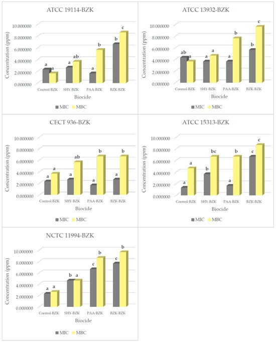 Table 4 and Figure 3 show the data for the MIC and MBC of BZK in the strains adapted to biocides. Most strains exposed to increasing sub-inhibitory concentrations of the biocides saw a slight increase in their MIC for BZK. The MIC values for SHY–BZK and PAA–BZK were in the range between 1.7 ± 0.6 ppm and 4.7 ± 0.6 ppm, with the exception of the L. monocytogenes strain NCTC 11994 adapted to PAA, which presented a value of 6.7 ± 0.6 ppm. However, unlike the rest of those exposed, the strains adapted through exposure to BZK had an increased MIC in all cases, ranging between 2.7 ± 1.2 ppm and 7.7 ± 1.2 ppm, as may be seen in Figure 3.