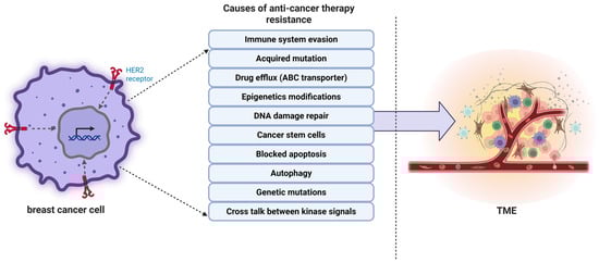Illustrates the multiple mechanisms by which HER2-positive breast cancer cells develop resistance to anti-cancer therapies. These include immune system evasion, acquired mutations, drug efflux via ATP-binding cassette (ABC) transporters, epigenetic modifications, DNA damage repair, cancer stem cell survival, inhibition of apoptosis, autophagy, and genetic mutations. Furthermore, crosstalk between kinase signaling pathways contributes to treatment failure. These resistance mechanisms not only sustain tumor cell survival but also influence the tumor microenvironment (TME), facilitating angiogenesis, immune suppression, and tumor progression. Created in BioRender. Babiker, R. (2025) https://BioRender.com/9inm7ec, accessed on 27 April 2025.