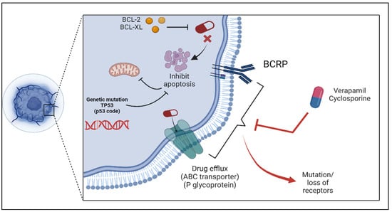 Key mechanisms of drug resistance in cancer cells, including apoptosis inhibition and drug efflux. Genetic mutations, such as TP53 (p53 code) mutations, lead to apoptosis resistance by disrupting mitochondrial pathways. Overexpression of BCL-2 and BCL-XL proteins further inhibits apoptosis, preventing cancer cell death. Additionally, ABC transporters like P-glycoprotein and BCRP (Breast Cancer Resistance Protein) actively pump drugs out of the cell, reducing their efficacy. Verapamil and cyclosporine are shown as inhibitors targeting drug efflux mechanisms. Mutations or loss of drug receptors further contribute to treatment resistance, limiting drug binding and effectiveness. Created in BioRender. Babiker, R. (2025) https://BioRender.com/1ctpwf3, accessed on 27 April 2025.
