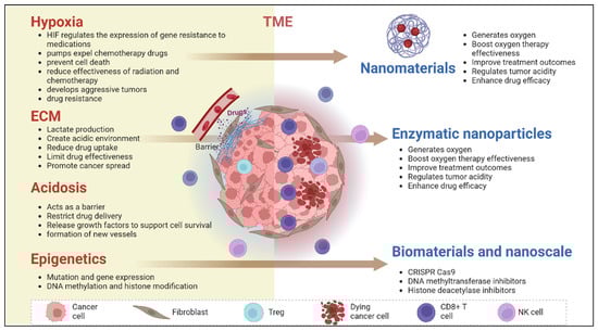 The tumor microenvironment (TME) and the role of biomaterials in overcoming treatment resistance. The TME contributes to drug resistance through the following aspects. Hypoxia: The low-oxygen conditions in tumors activate hypoxia-inducible factors (HIFs), which upregulate genes involved in drug resistance and promote efflux pumps that expel chemotherapy agents. This suppresses cell death, reduces radiotherapy and chemotherapy efficacy, fosters aggressive tumor behavior, and facilitates resistance. Extracellular matrix (ECM): The tumor ECM contributes to lactate production and acidic pH, creating a hostile environment that limits drug uptake and effectiveness while facilitating cancer cell invasion and metastasis. Acidosis: The acidic conditions of the TME act as physical and biochemical barriers, restricting drug penetration. It also promotes angiogenesis and supports tumor survival through growth factor release. Epigenetic modifications: Aberrant gene expression caused by DNA methylation and histone modifications leads to tumor progression and therapeutic resistance. Nanomaterials, enzymatic nanoparticles, and biomaterials at the nanoscale aim to enhance treatment efficacy by generating oxygen, regulating tumor acidity, and incorporating CRISPR-Cas9 systems, DNA methyltransferase inhibitors, and histone deacetylase inhibitors into nano-platforms, allowing for targeted epigenetic reprogramming, overcoming resistance and improving treatment precision. Created in BioRender. Babiker, R. (2025) https://BioRender.com/mo1lvv0, accessed on 27 April 2025.