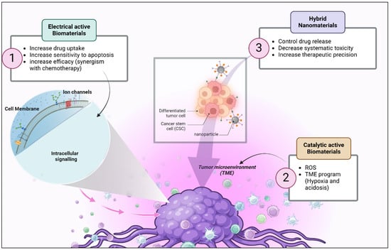 Different biomaterials targeting the tumor microenvironment (TME) to enhance cancer therapy. Electrically active biomaterials (green) increase drug uptake, enhance apoptosis sensitivity, and synergize with chemotherapy by interacting with ion channels on the cell membrane, affecting intracellular signaling. Catalytically active biomaterials (brown) modulate the TME by generating reactive oxygen species (ROS) and influencing hypoxia and acidosis. Hybrid nanomaterials (purple) improve drug delivery by controlling drug release, reducing systemic toxicity, and increasing therapeutic precision. The central illustration represents the TME, showing a tumor mass containing cancer stem cells (CSCs) and differentiated tumor cells, with nanoparticles interacting to improve treatment outcomes. Created in BioRender. Babiker, R. (2025) https://BioRender.com/v5pdxl2, accessed on 27 April 2025.