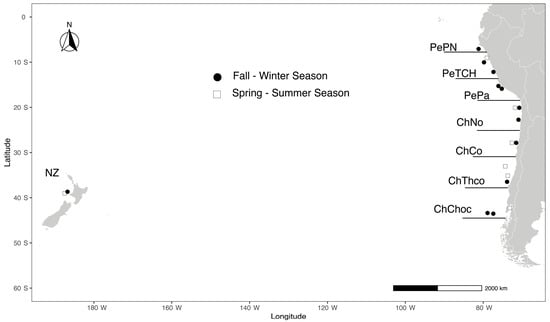 We collected a total of 852 individuals of Trachurus murphyi in 2011–2012 from 18 locations across the coastal areas of the SPO (i.e., Peru, Chile, and New Zealand; Figure 1) during fall–winter (_FW, N = 538) and spring–summer (_SS, N = 314) seasons. The fall–winter season (March to August) corresponds to the main period where fishery vessels catch Chilean jack mackerel; hence, there are no biological reproductive closures. Also, this period corresponds to the feeding time, so individuals disperse from their main reproductive areas to several points along the coast and ocean zones. The fall–winter season included twelve locations: six from Peru, five from Chile, and one from New Zealand. The fall–winter locations were aggregated as follows: PePN_FW (Pimentel), PeTCH_FW (Chimbote and Ancon), and PePa_FW (Cañete, Tambo de Moras, and Olleros) in Peru; ChNo_FW (Iquique and Mejillones), ChCo_FW (Coquimbo), ChThco_FW (Talcahuano coast), and ChChoc_FW (Chiloé oceanic) in Chile; and NZ_FW in New Zealand. The spring–summer season (October to February) corresponds to the spawning season, where fishery vessels are forbidden to catch Chilean jack mackerel [1] because of biological reproductive closures. This season, individuals move from feeding to their main reproductive areas [1]. The spring–summer season included six locations: one from Peru, four from Chile, and one from New Zealand. The spring–summer locations were aggregated as follows: PeTCH_SS (Chiclayo) in Peru; ChNo_SS (Iquique), ChCo_SS (Coquimbo), ChThco_SS (Talcahuano coast), and ChChoc_SS (Puerto Montt) in Chile; and NZ_SS in New Zealand. All previous genetic studies conducted on T. murphyi have collected samples from the fall–winter season because accessibility is easier. Here, we included the spawning season of Chilean jack mackerel samples to enhance the robustness in delineating population genetic structure [14], as well as the feeding season, anticipating the mixing of individuals from different areas.