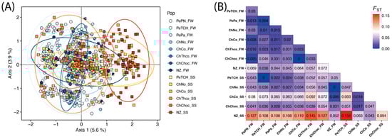 Overall, the PCA showed overlapping individuals from both geographical and temporal data, except for NZ_SS, where their dispersion is somewhat separated from the rest, but not for all (Figure 2A). The proportion of the variance explained by both axes was 9.5% (Axis 1 equal to 5.6 and Axis 2 equal to 3.9). Pairwise FST values were generally low (Figure 2B), with an overall average of 0.054. Within seasons, fall–winter showed an average FST of 0.029, while spring–summer showed a higher average of 0.077. The NZ_SS area showed pairwise FST values greater than 0.1 (ranging from 0.108 to 0.145) when compared to all fall–winter areas, except for NZ_FW (FST = 0.052). Compared to spring–summer areas, NZ_SS exhibited a particularly high value with PeCH_SS (FST = 0.156), the northernmost area.