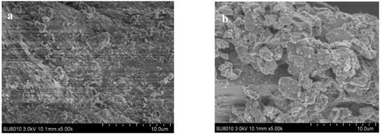 SEM was used to investigate the surface microstructure morphology. SEM images of the sewage sludge and SMB are shown in Figure 1. It could be seen that there were obvious differences between sewage sludge and biochar (Figure 1a). In contrast to the smooth surface of sewage sludge with limited porosity and ash deposition, the SMB biochar surface was characterized by a dense and heterogeneous dispersion of ash particles (Figure 1b). This could be explained by the volatilization of organic matter and water-gas shift reactions [6] during pyrolysis, which indicated that SMB has a high surface area for pollutant adsorption in soil remediation [29].