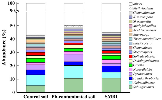 In order to investigate the influence of biochar application on microbial community structure and Pb immobilization, bacterial 16S rRNA gene sequences of soil, Pb-contaminated soil (i.e., SMB0), and soil amended with SMB application (1%, w/w) were analyzed (Figure 5). As shown in Figure 5, the bacterial communities of the three soil types are significantly different. It could be seen that the abundance of the bacterium genus Sphingomonas, which was found to be resistant to lead or other heavy metals [42,43], increased dramatically in Pb-contaminated soil and SMB-amended soil compared to the control soil.