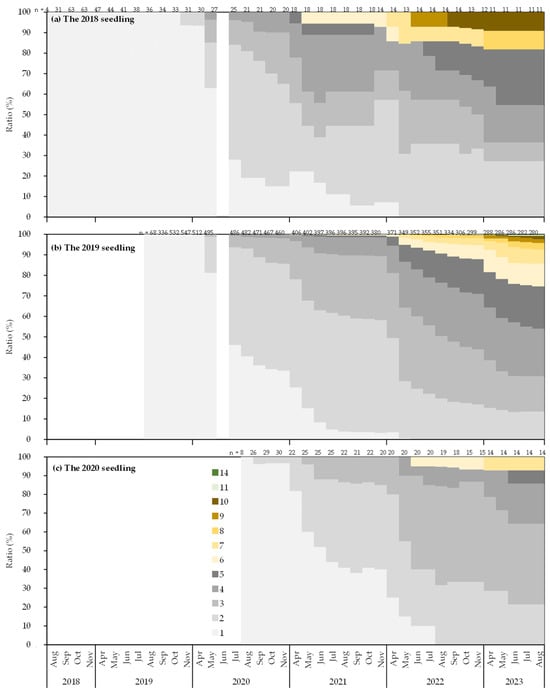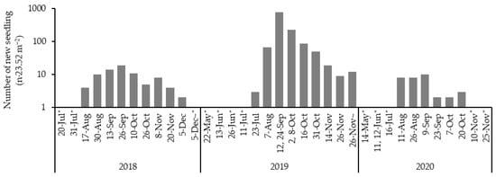 Chicago/Turabian StyleSuzuki, Hanami, and Hisashi Kajimura. 2025. "Growth Process and Mortality of Sasa borealis Seedlings over Six Years Following Mass Flowering and Factors Influencing Them" Biology 14, no. 5: 516. https://doi.org/10.3390/biology14050516