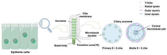 The basic composition of the cilia is remarkably evolutionarily conserved among species, and its core component consists of several highly conserved units: the ciliary membrane, axoneme, transition zone (TZ), and basal body (BB) []. The BB, derived from the centriole, anchors the cilia to the apical cytoplasm and plays a pivotal role in the spatiotemporal regulation of the cilia assembly process. The microtubule-based axoneme extends outward from the cell surface, forming the core structure of the cilium. The ciliary membrane is derived from the cell membrane, with the two membranes structurally interconnected. The axoneme exhibits two main structural patterns in the cross-section. In motile cilia, the axoneme follows a ‘9 + 2’ arrangement, consisting of nine outer microtubule doublets surrounding a central pair of microtubules. In contrast, primary cilia follow a ‘9 + 0’ arrangement, lacking the central microtubules. Transition fibers, located at the base of the cilium, connect the ciliary membrane to the basal body. The TZ, composed of protein complexes and Y-links, plays a crucial role in maintaining ciliary structure and function. Additionally, the intraflagellar transport (IFT) system, comprising IFT-A and IFT-B protein complexes, mediates the bidirectional transport of molecules along the cilium via kinesin-2 (anterograde) or dynein-2 (retrograde) motors [,] (Figure 1).