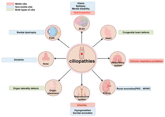 Ciliopathies impacting human organ systems due to dysfunction of motile and non-motile cilia. The illustrations show the different ciliopathies of tissues or organ systems and highlight the key manifestations in each affected organ. Red, blue, and green to show conditions from motile cilia issues, primary cilia defects, and both types of abnormalities. Abbreviations: PKD, polycystic kidney disease; NPHP, nephronophthisis. Reproduced from Ref. []. Copyright 2017, Springer Nature.
