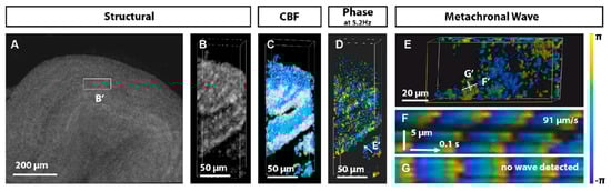 - Xia, T.; Umezu, K.; Scully, D.M.; Wang, S.; Larina, I.V. In vivo volumetric depth-resolved imaging of cilia metachronal waves using dynamic optical coherence tomography. Optica 2023, 10, 1439–1451. [Google Scholar] [CrossRef]
