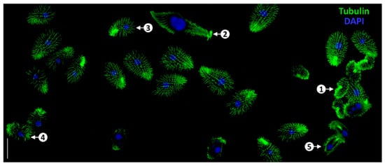 Successful outcome of tubulin staining in a mixed population of ciliate cells, including C. inflata (1), Lacrymaria olor (2), T. thermophila (3), C. hirtus (4), and C. uncinata (5). Scale bars = 50 μm. Reproduction from Ref. []. Used under Creative Commons CC-BY license.