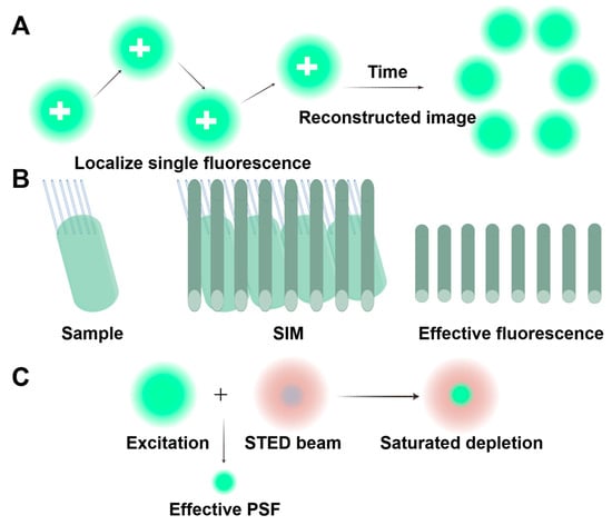 Principles of the three main super-resolution techniques. (A) The principle of single-molecule localization microscopy (SMLM). SMLM activates and precisely locates individual fluorescent molecules in repeated cycles. By compiling these isolated positions, it constructs a 3D super-resolution image that surpasses conventional resolution limits. (B) The principle of structured illumination microscopy (SIM). SIM uses patterned light to create low-frequency interference (Moiré pattern) with samples. By capturing shifted images, it reconstructs observable structures, but details finer than the pattern’s frequency (like the upper part of the sample) remain undetectable. (C) The principle of stimulated emission depletion (STED). STED microscopy uses a donut-shaped laser (center-aligned with the excitation spot) to suppress peripheral fluorescence via a saturation effect and narrows the emission area below the diffraction limit, enabling super-resolution imaging. Reproduced from Ref. [], Chen, J., et al. Used under Creative Commons CC-BY license.