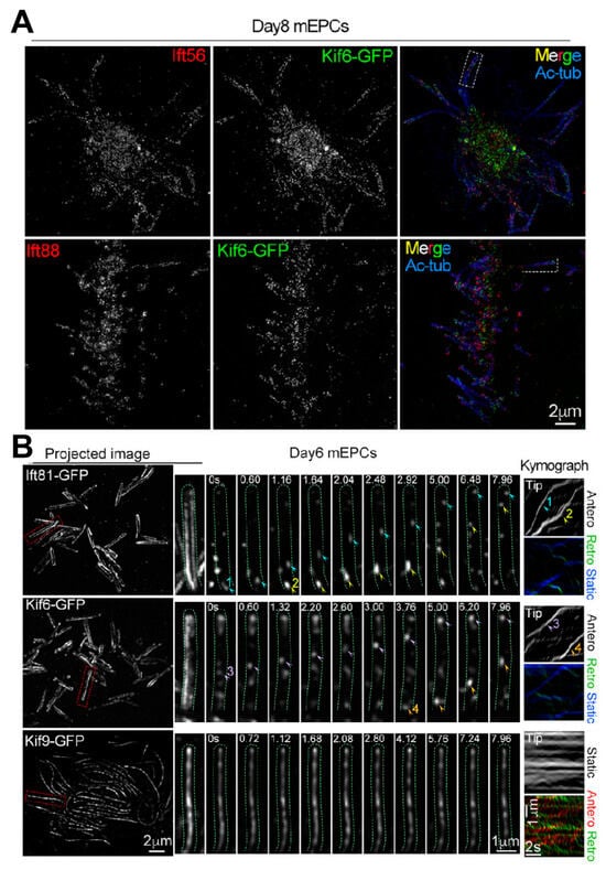 Spatiotemporal dynamics of exogenous Kif6/Kif9 in ependymal cilia. (A) 3D SIM visualization revealed spatial distributions of Kif6-GFP relative to Ift56 and Ift88, with acetylated tubulin (Ac-tub) serving as axonemal markers. (B) GI-SIM dynamic imaging captured motile trajectories of ciliary Kif6-GFP and Kif9-GFP. The mEPCs underwent adenoviral transduction to express GFP-tagged constructs, with Ift81-GFP as a positive control. Arrowheads highlight traceable GFP puncta demonstrating directional movement patterns. The trafficking trajectories of the GFP puncta projected in the first 200 frames of videos 1, 2, 3 and 4 are shown as projected images. From Ref. []. Used under Creative Commons CC-BY license.