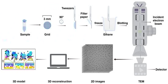 Cryo-EM, which was awarded the Nobel Prize in Chemistry in 2017 for advancements in structural biology, is a groundbreaking technique that enables the three-dimensional reconstruction of biological macromolecules [,]. This method involves freezing materials at ultra-low temperatures, facilitating the observation and analysis of biological samples while allowing high-resolution imaging at the atomic level [] (Figure 9). Cryo-EM employs two primary approaches for imaging: cryo-electron tomography (cryo-ET) and single-particle analytical imaging.