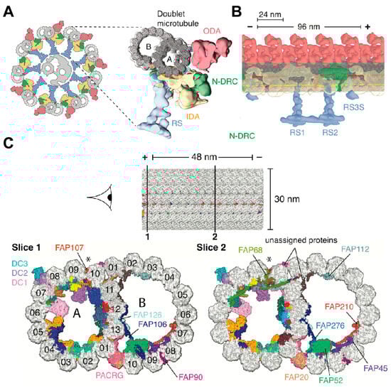 - Ma, M.; Stoyanova, M.; Rademacher, G.; Dutcher, S.K.; Brown, A.; Zhang, R. Structure of the Decorated Ciliary Doublet Microtubule. Cell 2019, 179, 909–922.e12. [Google Scholar] [CrossRef]