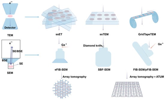 Overview of vEM techniques. vEM integrates TEM- and SEM-based methods for 3D ultrastructural imaging. vEM employs electron beam–sample interactions to generate serial images: TEM detects transmitted/scattered electrons through ultrathin sections (50–70 nm), while SEM captures backscattered/secondary electrons (BSE/SE) from surfaces. TEM modalities include serial-section electron tomography (ssET) reconstructing 200–300 nm slices via tilt-series imaging, serial-section TEM (ssTEM) for grid-mounted sections, and GridTape TEM automating high-throughput tape-fed imaging. SEM methods involve eFIB-SEM (enhanced ion milling with bias control), SBF-SEM (diamond knife sectioning), FIB-SEM/pFIB-SEM (ion/plasma beam milling), or sequential imaging of serial slices on a substrate such as a silicon wafer (array tomography). Ultramicrodissection is partially automated by collecting the slices on a tape. Abbreviations: FIB-SEM, focused ion beam SEM; SBF-SEM, serial block-face scanning electron microscopy; ATUM, automatic tape-collecting ultramicrotome. Reproduced from Ref. [], Peddie, C. J., et al. Used under Creative Commons CC-BY license.