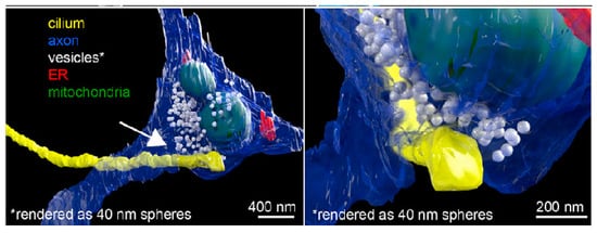 vEM has been used for morphological studies of cilia. Wang’s group used focused ion beam scanning electron microscopy (FIB-SEM) to image and three-dimensionally reconstruct the multicilia of ventricular membrane cells and investigated at the ultrastructural level how Cenpj mutations induced primary microcephaly []. Mytlis et al. used TEM, serial block-face scanning electron microscopy (SBF-SEM), and other techniques to discover the presence of primary cilia in the meiotic prophase of zebrafish primary oocytes []. Meanwhile, Sheu et al. discovered primary cilia on the surface of a neuron, which formed a specialized connection with the axon of another neuron (called axo-ciliary synapse), through [] (Figure 13). Another study analyzed cilia in human pancreatic islets and determined their size and formation with FIB-SEM []. As previously established, substantial research has focused on the intrinsic structure of cilia. vEM can observe the surface contours and structures of samples at exceptional resolution. This allowed for observation and measurement of morphological features, including axon length and diameter.