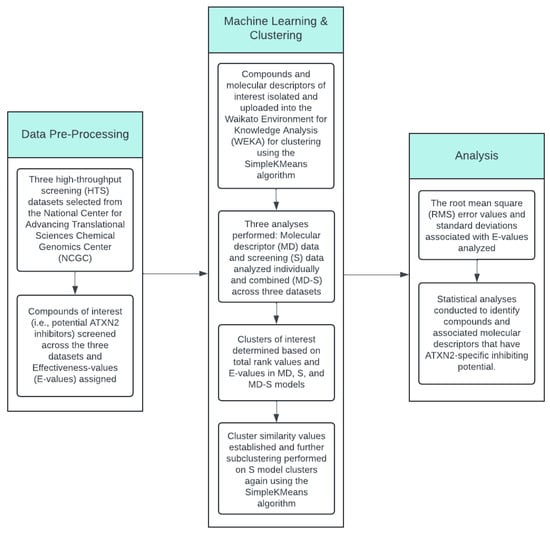 Statistical analyses were conducted to identify molecular descriptors associated with compounds that had ATXN2-specific inhibiting potential. Continuous variables (e.g., maximum response assay values, molecular descriptor average values) were presented as mean values ± standard deviations. All data were tested for normality (D’Agostino and Pearson omnibus normality test) and homogeneity of variance (F-test). To determine statistical significance between two variables, data were subjected to a two-tailed unpaired parametric Student’s t-test when assumptions for normality and homogeneity of variance were met, a Mann–Whitney non-parametric test when normality was violated, and a Welch’s corrected t-test when homogeneity of variance was violated. To account for multiple comparisons and control for the false discovery rate (FDR), a Benjamini–Hochberg correction was applied to p-values. The significance level was set at 0.05 for all tests. All statistical analyses were performed using GraphPad Prism version 10.2.3 (GraphPad Software, La Jolla, CA, USA). The comprehensive methods utilized in the present study are concisely diagramed in Figure 1.