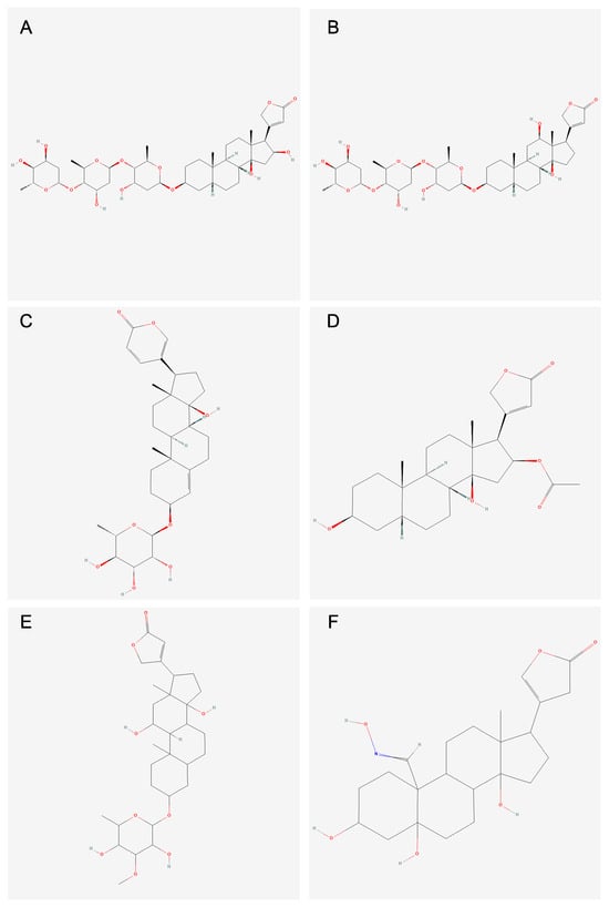 Cluster 24_1 contained compounds with high aromatic ring count, aromatic atom count, aromatic bond count, and carboaromatic ring ratio. Cluster 4_0 contained the following six compounds: Gitoxin (PubChem CID: 91540), Digoxin (PubChem CID: 2724385), Proscillaridin (PubChem CID: 5284613), Oleandrigenin (PubChem CID: 9802865), Sarnovide (PubChem CID: 276294), and Strophanthidin oxime (PubChem CID: 4024368). These compounds shared molecular descriptors such as high aliphatic ring count, asymmetric atom count, carbo ring count, and chiral center count. The chemical structures of the six compounds in cluster 4_0 are shown in Figure 2. The chemical structures of the seven compounds in cluster 24_1 are reported in Supplementary Figure S4.