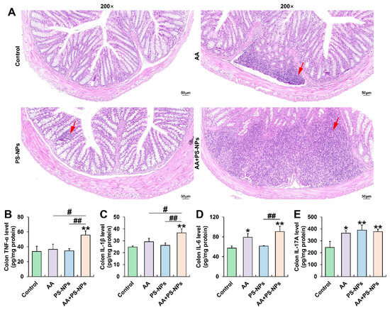Figure 1. Effects of exposure to AA and/or PS-NPs on colonic histopathology and inflammatory cytokine levels. (A) Representative images of colon sections stained with H&E (200×). The red arrows display inflammatory infiltration. (BE) Colonic TNF-α, IL-1β, IL-6, and IL-17A levels. Data are presented as means ± SD (n = 3). * p < 0.05 and ** p < 0.01 compared to the control group; # p < 0.05 and ## p < 0.01 compared to the AA + PS-NP group.