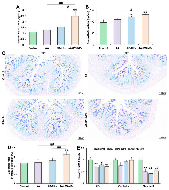 Figure 2. Effects of exposure to AA and/or PS-NPs on mucus secretion and intestinal barrier in colon of mice. (A) Serum LPS content. (B) Serum DAO activity. (C) Representative images of colon sections stained with AB-PAS (150×). (D) Coverage ratio of mucus secretion. (E) Relative mRNA levels of colonic ZO-1, Occludin, and Claudin-5. Data are presented as means ± SD (n = 3). * p < 0.05 and ** p < 0.01 compared to control group; # p < 0.05 and ## p < 0.01 compared to AA + PS-NP group.