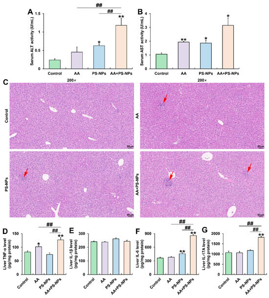 Figure 3. Effects of exposure to AA and/or PS-NPs on serum biomarkers, histopathology, and inflammatory cytokine levels in the liver. (A) Serum ALT activity. (B) Serum AST activity. (C) Representative images of liver sections stained with H&E (200×). The red arrows display inflammatory infiltration. (DG) Hepatic TNF-α, IL-1β, IL-6, and IL-17A levels. Data are presented as means ± SD (n = 3). * p < 0.05 and ** p < 0.01 compared to the control group; ## p < 0.01 compared to the AA + PS-NP group.