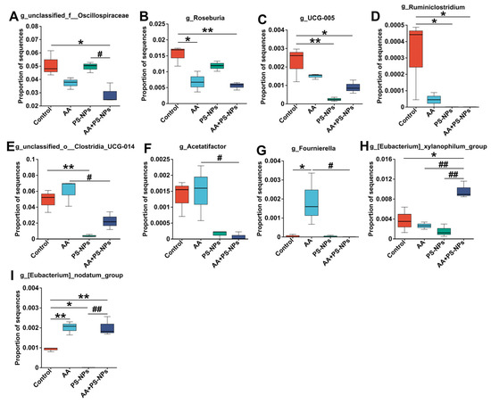 Figure 6. Differentially abundant microbes at the genus level between groups. (A) unclassified_f__Oscillospiraceae. (B) Roseburia. (C) UCG-005. (D) Ruminiclostridium. (E) unclassified_o__Clostridia_UCG-014. (F) Acetatifactor. (G) Fournierella. (H) Eubacterium_xylanophilum_group. (I) Eubacterium_nodatum_group. Data are represented as means ± SD (n = 3). * p < 0.05 and ** p < 0.01 compared to the control group; # p < 0.05 and ## p < 0.01 compared to the AA + PS-NP group.