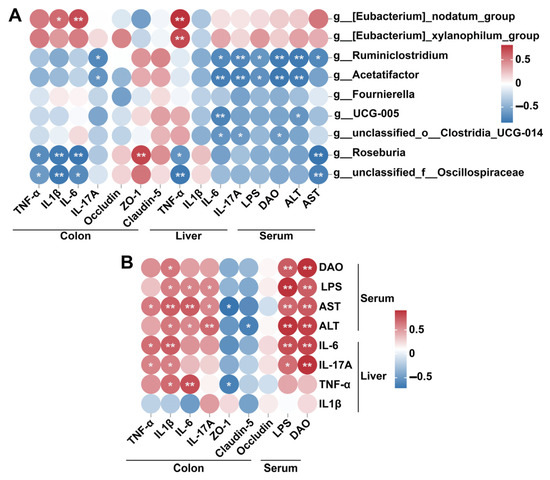 Figure 7. Spearman′s correlation analysis between differentially abundant genera and related indicators involved in intestinal damage and liver injury (A), and between intestinal damage-related indicators and liver injury related indicators (B). * p < 0.05; ** p < 0.01.