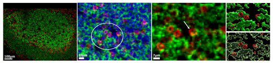 Representative confocal images showing the expression of CD3 (red), CD20 (green), and nuclear (blue) in a tonsillar follicle (scale bar: 70 m) (left panel) as well as zoomed areas (scale bar: 10 m and 5 m, middle panel). The interconnected/fused membranes between cells are shown too (right panels). White arrow points to a CD3/CD20 ‘conjugate’ in a zoomed area (white circle). Imaris modules were used for the generation of ‘isothermic’ surfaces for the visualization of the CD3 (red)/CD20 (green) membranes.