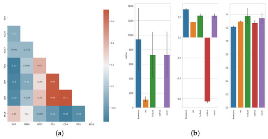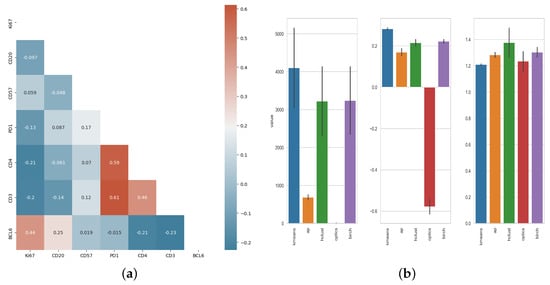 For each segmented cellular event, the position (X, Y) coordinates along with the raw intensities of the markers used were extracted and used for downstream analysis. A consistent correlation among PD1, CD3, and CD4 was found, with Pearson’s R coefficients ranging from 0.69 to 0.71 (Figure 3a), while Ki67 and CD20 had the weakest correlation with other markers (Pearson’s R range: [−0.3, 0.33] and [−0.14, 0.2] respectively). Then, different clustering algorithms were applied for further unsupervised analysis of the imaging data. The performance of each algorithm was evaluated based on its score for Silhouette, Calinski-Harabasz and Davies-Bouldin profiles (Figure 3b).