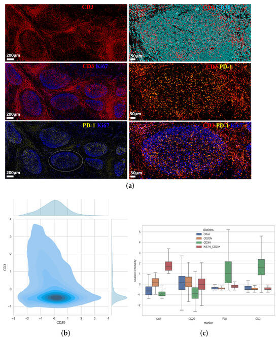 Then, imaging data (Polaris mIF) were analyzed with HistoCytometry, an established methodology for the analysis of imaging data using the FlowJo platform [14,31,32] (Figure 6a). Analysis of two tonsils showed a CD20highCD3high cell population (9 and 11.5% of total follicular cells) (Figure 6a and Supplemental Figure S1) in line with the aforementioned identified clusters (Figure 3a). Although in lower frequency compared to CD20lowCD3high, we found a high representation of CD3highPD-1high Tfh cells in CD20highCD3high cell compartment (Figure 6a and Supplemental Figure S1). In line with our unsupervised clustering analysis, Ki67 was found to be associated with B cells while PD-1 expression was almost exclusively associated with CD3 T cells (Figure 6a and Supplemental Figure S1).
