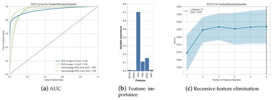 Model statistics: AUC curves for Gradient Boosting Classifier (best-performing model) with classes 0.0 = PD1 negative cells, classe 1.0= PD1 positive cells (a). Features importance for best performing model (b). RFE for the same model wit 95% confidence interval (c).