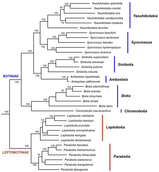The “Mitogenome dataset” was built by combining the 21 mitogenome sequences newly obtained in this study and the 99 mitogenome sequences (14 for Botiidae, 85 for outgroups) downloaded from the GenBank (Table 1 and Table S1). The 120 whole mitogenome sequences were aligned following the same procedures detailed in [32]. The final alignment is 14,888 bp in length, with 11,391 sites from the 13 protein-coding genes, 2096 sites from the two rRNA genes, and 1401 sites from the 22 tRNA genes.