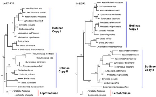 All phylogenetic trees built in this study (Figure 1, Figure 2 and Figure 3), except for the EGR3 tree (Copy I), strongly supported or at least did not reject the following relationships among Botiidae. Leptobotiinae/Botiinae, Leptobotia/Parabotia, Chromobotia/Botia, Yasuhikotakia/Syncrossus, and Sinibotia/Ambastaia are all sister taxa. Clades formed by the last two generic pairs are sisters to each other. The clade formed by these four genera is sister to the clade formed by Chromobotia/Botia. The above relationships have also been shown by the RAG1 tree of Bohlen et al. (2016) [25]. In the EGR3 tree (Copy I), Ambastaia and Sinibotia did not form a sister group (Figure 3). That might be the result of incomplete lineage sorting.